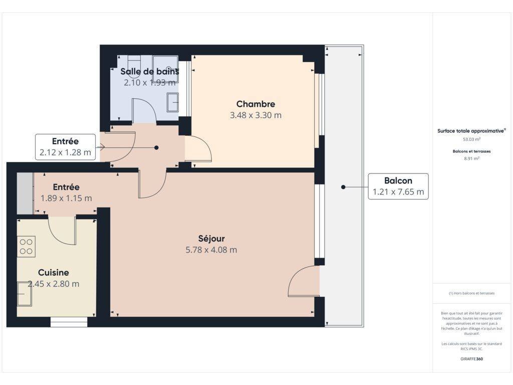 - Fully equipped kitchen, accessible from the living room via a small hall with built-in wall storage